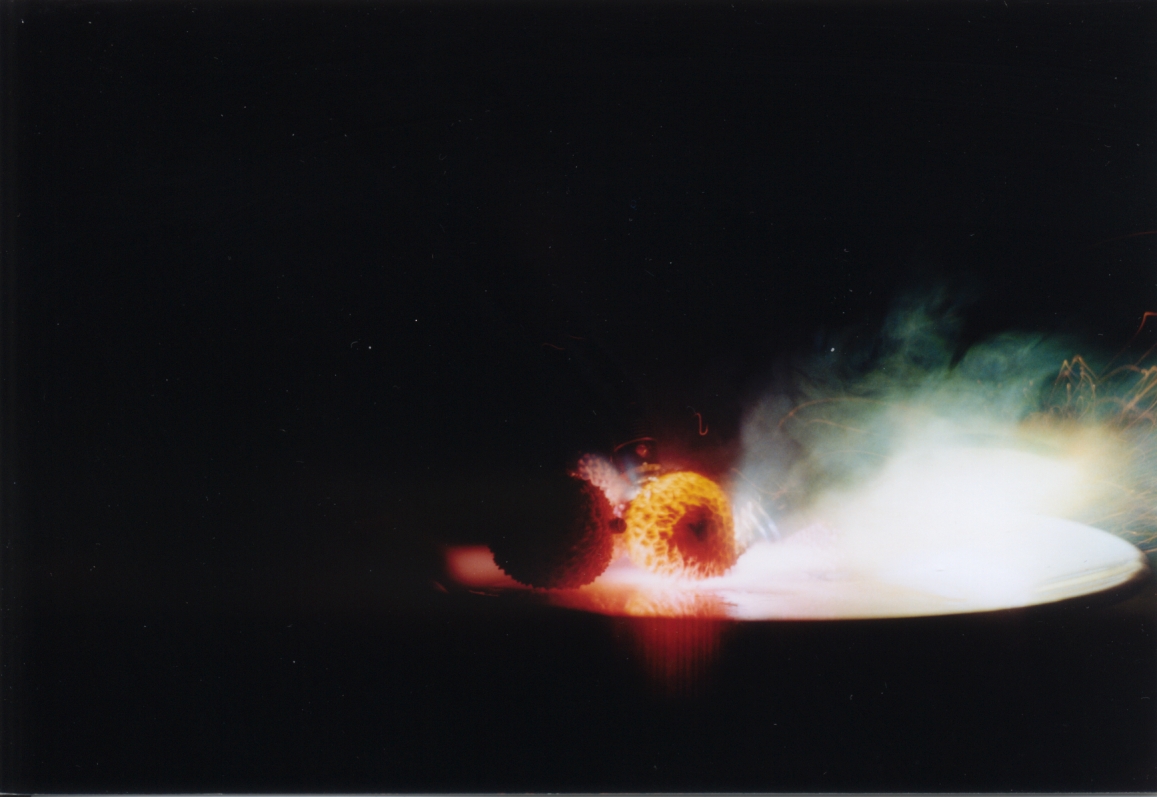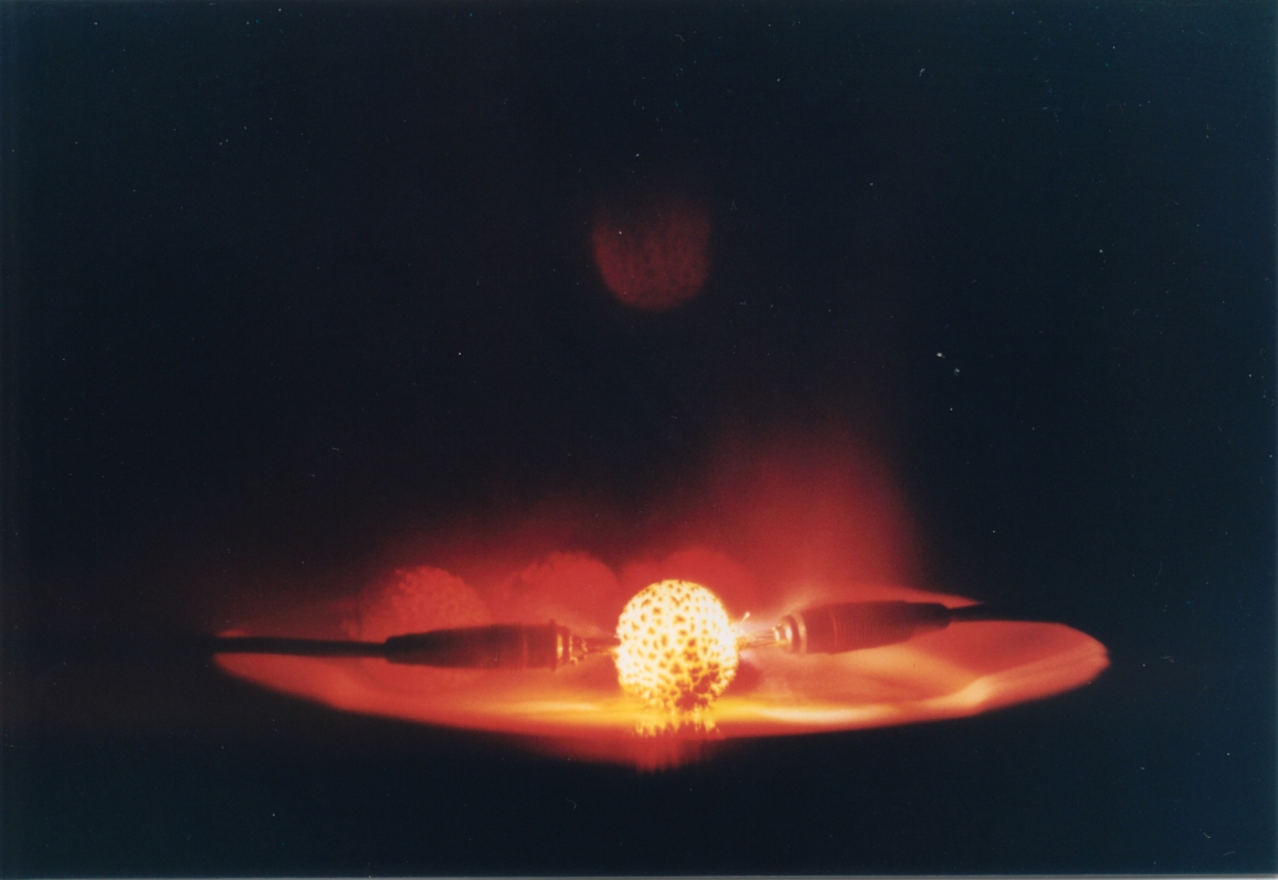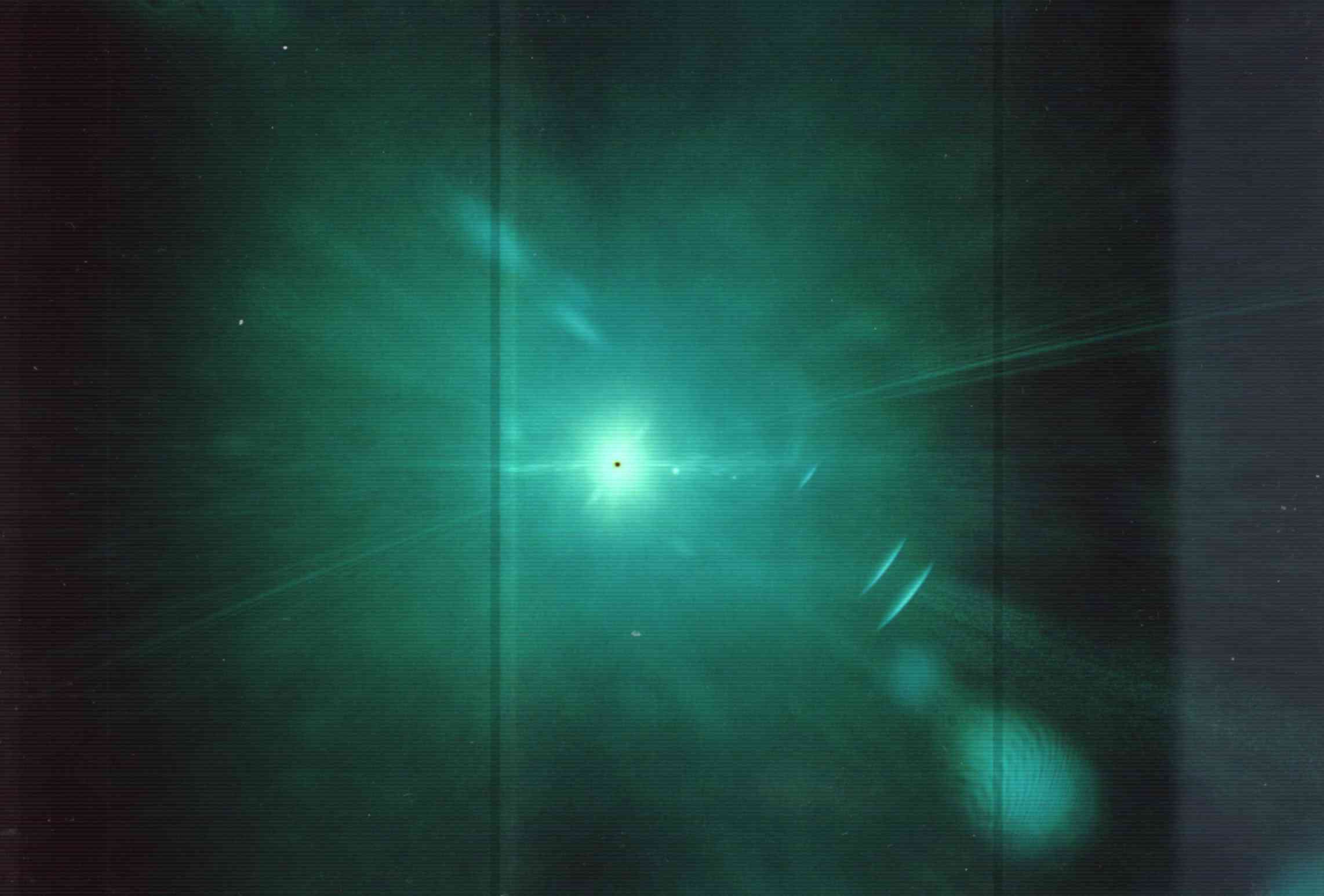Ein Blick, den man besser nicht riskieren sollte-direkt in einen Laser. Trotz einer Belichtungszeit von nur 1/1000 Sekunde hat der Laser ein Loch in den Film gebrannt. |
